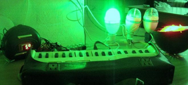 Конструктивное оформление разработки (см. фото действующего экспериментального образца) реализовано в виде фотоэлектронного пульсометра, выходной электрический сигнал которого поступает на вход многоканального частотного компаратора, обеспечивающего селективное (в зависимости от частотной структуры сердечного ритма) включение соответствующего цветодинамических проектора. При низких показателях ЧСС включается цветодинамический проектор с зеленым световым излучателем, а по мере увеличения показателя ЧСС, соответственно динамике сердечного ритма включаются цветодинамические проекторы с синим или красным световыми излучателями, расположенными под состоящими из множества линз вращающимися оптически прозрачными куполами. При превышении задаваемого верхнего порога показателя ЧСС (например, более 90 уд/мин) включается настольное малогабаритное устройство – имитатор пламени костра, состоящий из галогенных ламп, светофильтров и шелковых лоскутов красной ткани, развеваемых воздушным потоком встроенного вентилятора (Чаусовский Г., 2012). Между лоскутами красной ткани, имитирующими при воздействии воздушных потоков вентилятора «трепещущие языки пламени», расположена оптически прозрачная фигурка сердца.