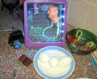 Конструктивное оформление разработки реализовано (см. фото) в виде размещенной на обеденном столе малогабаритной тонкостенной LED – панели, на оптически прозрачной акриловой подложке которой закреплено фото лица едока. Под фото флуоресцентным маркером сделан невидимый при обычном освещении рисунок гротескной фигуры человека с характерными внешними признаками ожирения (отсутствие талии, висячий живот и т.д.). На подложке флуоресцентным маркером также написаны невидимые при обычном освещении аффирмации, способствующие формированию в подсознании требуемого отношения к стилю пищевого поведения, в частности, активации волевого потенциала личности для осуществления самоконтроля за темпом потребления пищи.