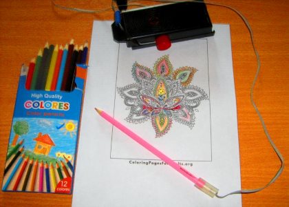 Конструктивное оформление разработки (см. фото) реализовано в виде сменного, фиксируемого на карандаше или кисточке, миниатюрного аппликатора – высокочувствительного сенсора механических вибраций. Электрические контакты вибросенсора включены в цепь управления портативным электронным синтезатором мелодичных звуков. Такое техническое решение разработки обеспечивает синхронизацию движений руки при раскраске рисунка с формированием музыкальной мелодии. При этом каждое очередное движение карандаша или кисточки при раскрашивании рисунка сопровождается генерированием нового мелодичного звука и формированием тем самым «музыки раскраски», ритм которой соответствует частотным параметрам движения руки при реализации приемов художественной арт - терапии (раскрашивании). Тем самым обеспечивается возможность сочетанного осуществления приемов художественной и музыкальной арт – терапии.