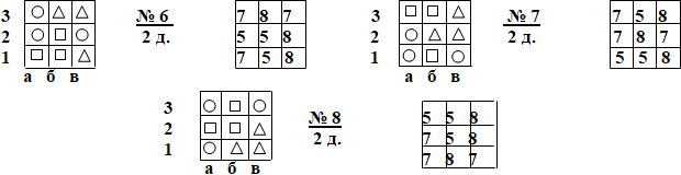 Обсудив предложенные детьми варианты первого и второго действий, организатор записывает одно из решений, например: 1) А2—В2, 2) Б2—В1 (рис.4) и поясняет его смысл: «Сначала, – первым действием, – можно поменять местами круг и треугольник в угловых верхних клетках, – А2 и В2. Тогда круги будут там, где четверки, а треугольник будет в клетке В2. Потом, – вторым действием, – этот треугольник можно поменять местами с квадратом из Б1. Тогда треугольники будут там, где восьмерки, а квадраты, где шестерки …».