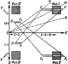 Видимо, следует предположить, что фигура DEFG могла бы быть перевернута относительно оси ОС, и тогда мы с ее помощью отразили бы проблему «черт лидера» применительно к группе типа корпорации с взаимоотношениями, интенсивно опосредствованными антисоциальными ценностными характеристиками (фигура II). Тогда на полюсах Е1; F2 можно ожидать любого набора любых черт руководителя, так как качества личности его вообще не могут иметь значения, в связи с тем что он бюрократическим способом навязан группе и пользуется властью не в силу каких-либо своих достоинств, а исключительно за счет извне полученных прерогатив. На другом полюсе может быть выделен (он экспериментально и в самом деле неоднократно выделялся) сравнительно небольшой набор качеств, создающих наиболее благоприятные качества для свободного общения и всеобщего благоденствия в группе (фигура IV), где люди связаны друг с другом только эмоциональными притяжениями, а не какой-либо деятельностью (интеллектуальное превосходство, доброта, сострадание, внешняя привлекательность). Если мы продолжим линии E1D1 и F1G1 за пределы социума, то, очевидно, окажемся... в «царствии небесном» (или, если не терять под ногами почвы науки, в мире идеальных представлений о душевных качествах лучших среди простых смертных). Обратившись к патристике, мы найдем довольно скудный набор богоугодных качеств у серафимов, херувимов, архангелов и всех других небесных «лидеров», точнее «заступников» и «хранителей» в ангельском чине.