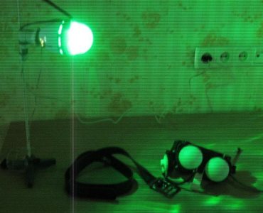 Конструктивное оформление разработки реализовано (см. фото действующего образца) в виде портативного настольного цветодинамического проектора, состоящего из закрепленного на валу низкооборотного микроэлектродвигателя комплекта зеленых светодиодных излучателей и оптических линз, формирующих красочную динамичную картину светоэффектов в трехмерном пространстве. Включение микроэлектродвигателя цветодинамического проектора осуществляется с помощью закрепленного на поясе сенсора ритма диафрагмального дыхания. На такте «вдоха» микроэлектродвигатель выключается, что сопровождается формированием в трехмерном пространстве статической картины множества зеленых световых бликов, которые «оживают» (плавно перемещаются) в объемном пространстве при автоматическом включении микроэлектродвигателя на такте медленного «выдоха» и последующей паузи. Респираторно – синхронизированные светоэффекты визуализируются пользователем с помощью специально разработанных автором очков (Чаусовский Г., 2014 ), на оправе которых закреплены полупрозрачные полусферы. визуализация светодинамических красочных сюжетов сквозь гомогенную визуальную среду (оптически полупрозрачные полусферы) сопровождается формированием объемного оптического иллюзионного эффекта «мерного покачивания на зеленых волнах», что способствует инициированию весьма значимого для нормализации показателей артериального давления состояния релаксации и эмоциональной стабильности.